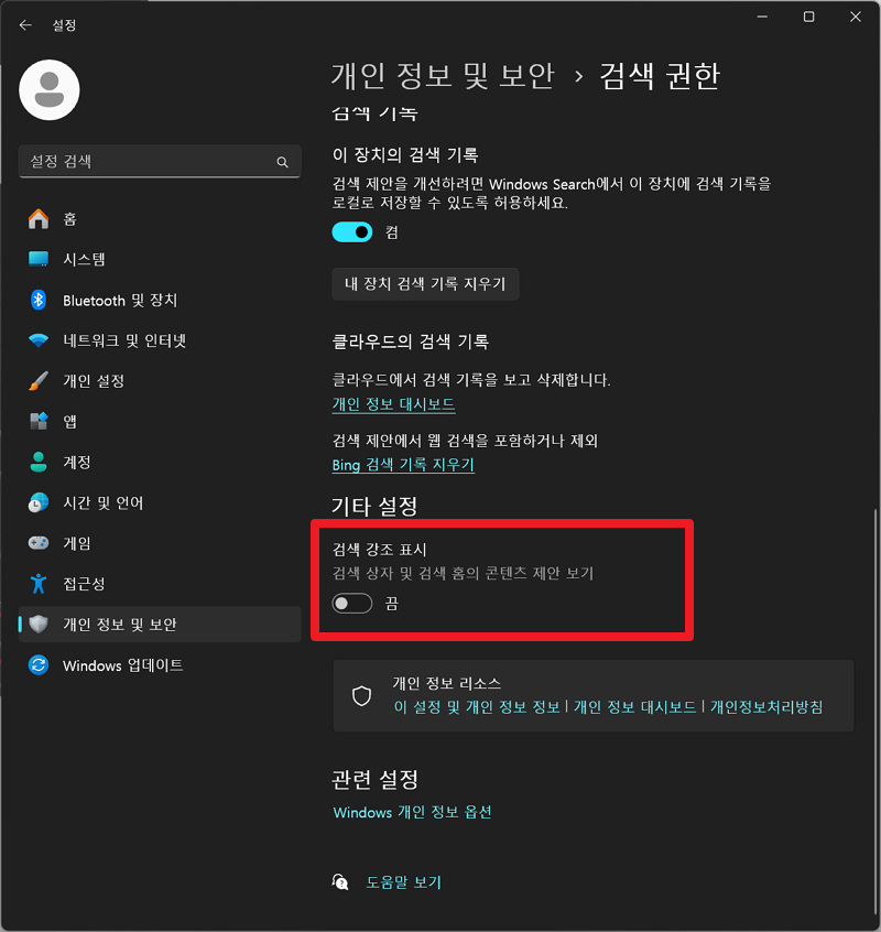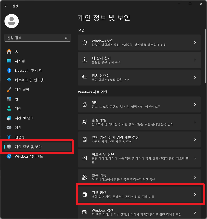 "๊ฐ์ธ ์ ๋ณด ๋ฐ ๋ณด์" ์์ "๊ฒ์ ๊ถํ" ์ ๋ค์ด๊ฐ๊ธฐ